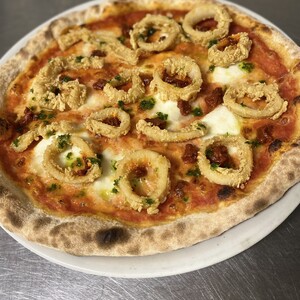 Pomodoro,mozzarella,mozzarella di bufala campana DOP,calamari Fritti e ‘nduja calabrese.